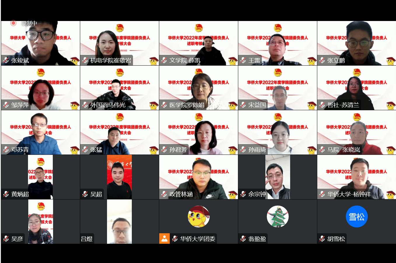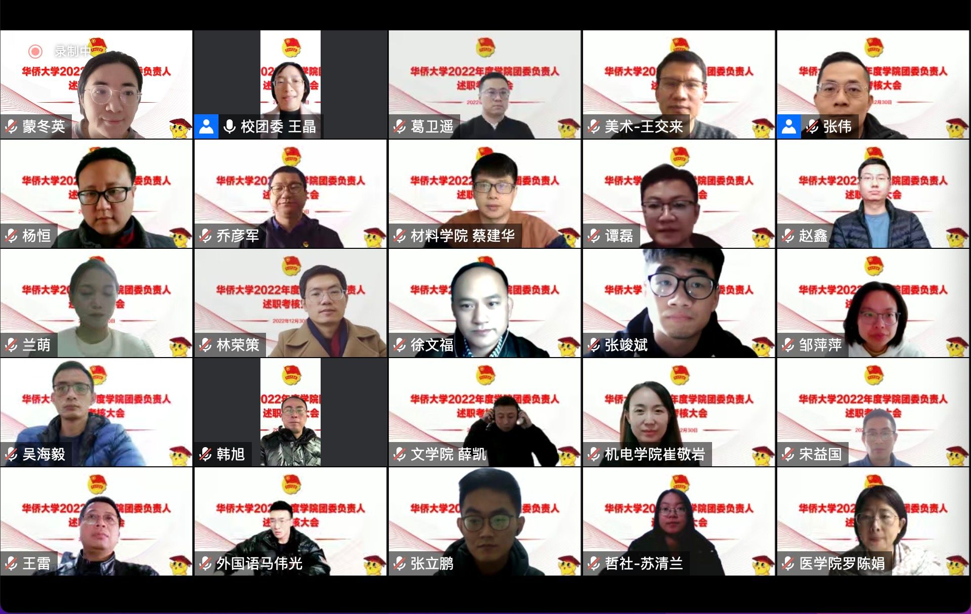 2022年12月30日,华侨大学2022年度学院团委负责人述职考核工作交流会以线上会议的形式开展。基层团委负责人代表本级团组织向上级团委述职是团中央紧抓基层组织建设的重要措施,华侨大学按照上级团组织的工作部署,将在每年年底常态化开展基层团委负责人述职考核工作。国际学院、哲学与社会发展学院等27个学院团委负责人参加述职考核工作交流会,校团委副书记张伟主持本次交流会。校团委常委王晶、黄炳超、吴彦、吴超及学生代表出席交流会并担任评委。27位学院团委负责人依次发言,通过PPT演示对本年度共青团工作进行总结和反思。
