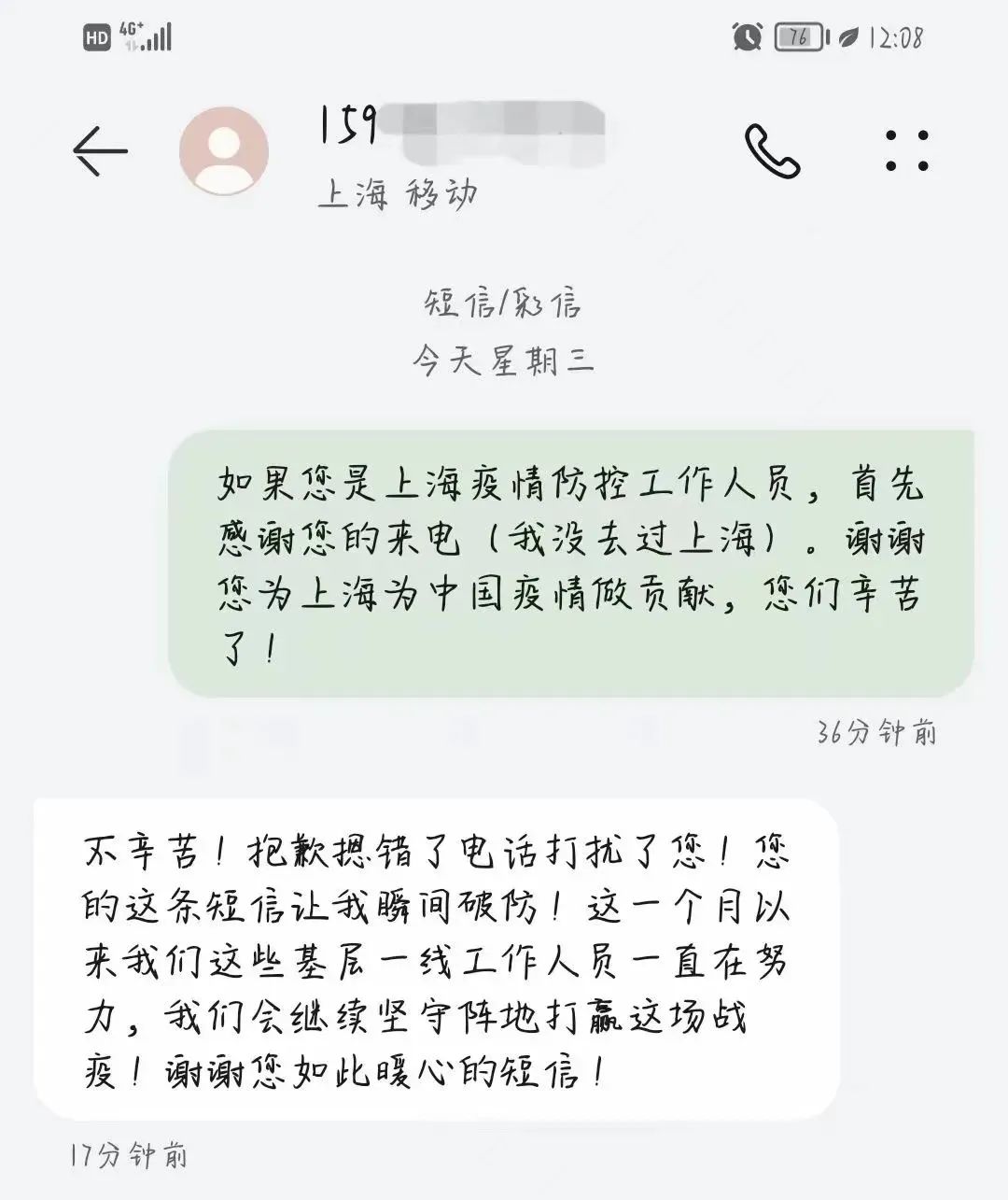 据张老师回忆,13日上午11点多,他接到了一通来自上海市防疫人员的电话,通知张老师及时完成核酸检测。原来是防疫人员误拨号码了,然后,就有了截图中那暖心的一幕。