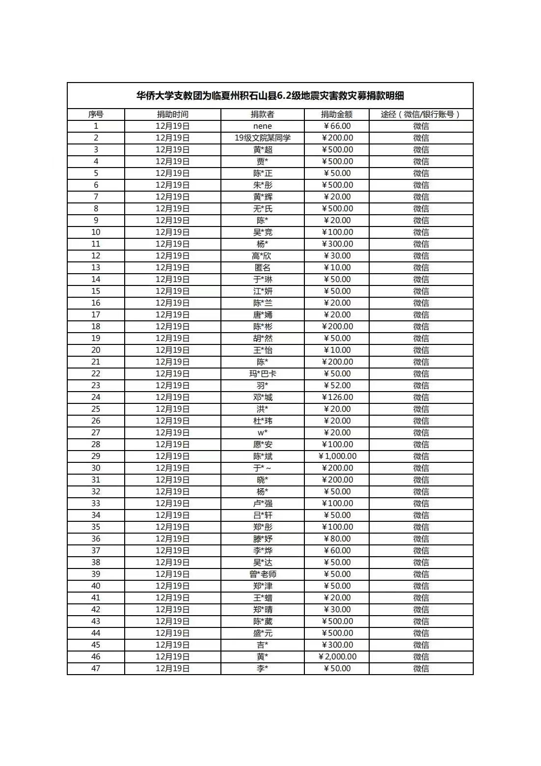 2023年12月18日,积石山县发生6.2级地震。学校面向全体师生发出了《向积石山县地震灾区爱心捐款的倡议书》,为响应学校号召,方便爱心人士持续关注募捐情况、方便校地对接捐款工作,现延用华侨大学支教团募捐账户继续向全体学生募捐。截至2023年12月27日13时,华侨大学支教团共收到捐赠资金157188.57元,为地震后重建工作作出贡献。