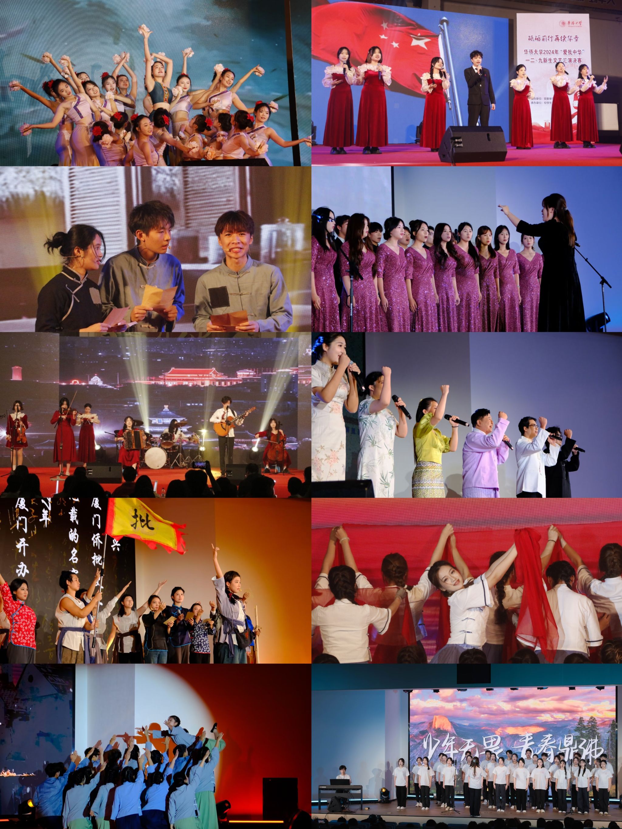 演出现场,《穿越历史记忆》《赤色南洋》《纸诉华情》《侨说》《侨批之歌》等曲艺类节目展示了中华民族一步步迈向繁荣昌盛的历程,体现了侨校学子炽热的爱国情怀;《无名的功勋》《长路》《军工之花》《橘颂》《缅桂花开朵朵香》等舞蹈类节目体现了中华优秀传统文化的内涵,展示青年学子青春朝气的精神面貌;《红帆》《寸心》《永不言弃》《紫荆花盛开》《期颐》等声乐类节目热情讴歌新中国从站起来、富起来到强起来的伟大复兴之路,《灯火里的中国》《我的祖国》《海阔天空》《同一首歌》《万疆》《盛世国乐》等器乐类节目经同学们改编演绎,或宛转悠扬,或气势磅礴,赢得现场阵阵掌声。
