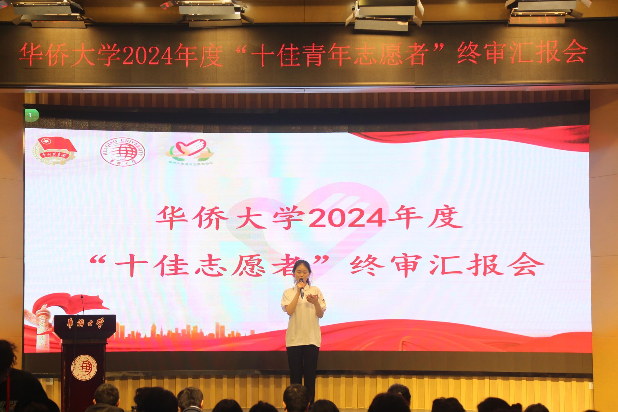 2025年4月26日上午9时,华侨大学隆重举行2024年度“十佳青年志愿者”终审汇报会,21位优秀志愿者候选人通过现场演讲与视频展播形式,向全校师生展现了新时代青年的志愿风采。学校职能部门、各学院分管志愿服务辅导员及学生代表共同见证了这场彰显奉献精神的青春盛会。