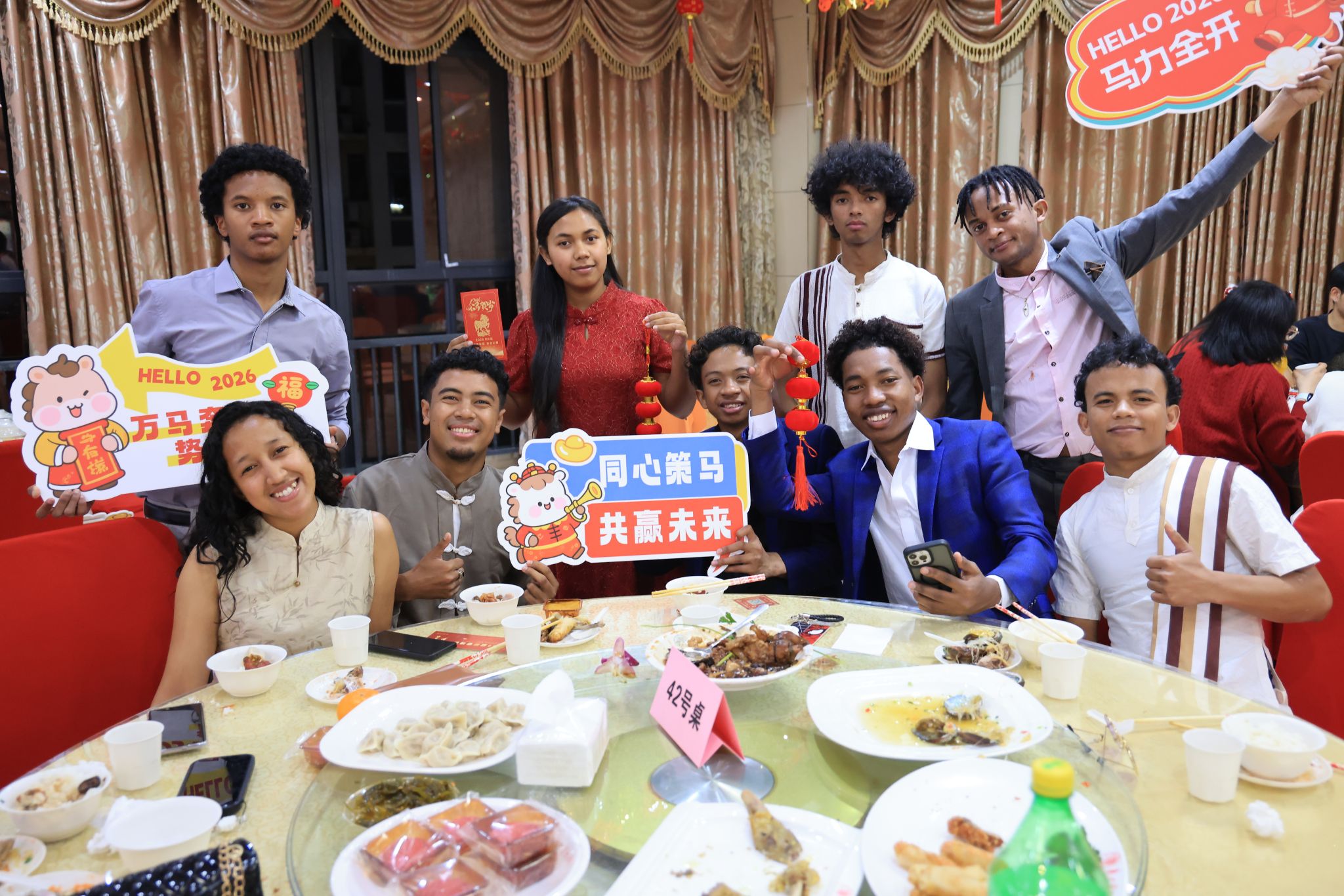 同步举行。留校过年的中外师生欢聚一堂,共享“年夜饭”,喜迎“中国年”。