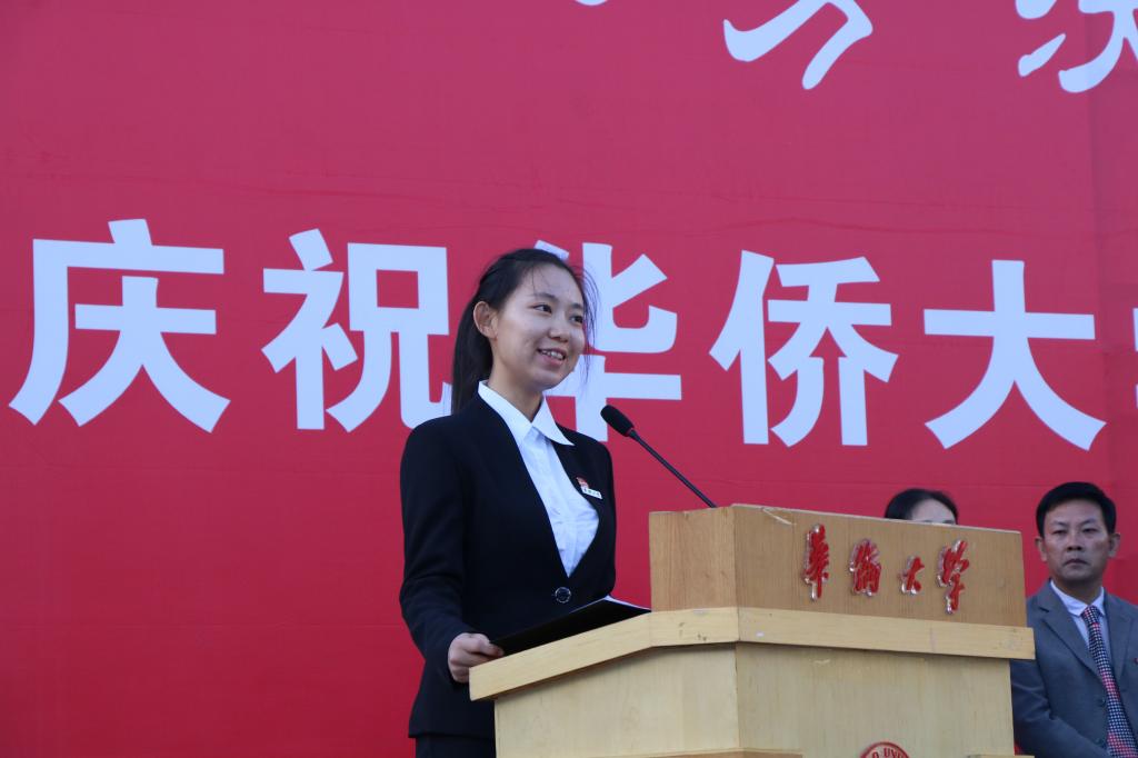 计算机学院2015级杜梓林同学和文学院2017级新生乔馨同学代表广大华园学子表达了对华侨大学建校57周年的祝福。杜梓林同学回首在华园的三年时光,抒发了对厦门校区蓬勃发展的骄傲自豪之情,并表示自己将不忘母校的嘱托与希望,砥砺前行。乔馨同学倡议到,让我们厉兵秣马,携手前行,纵使长路漫漫,且看吾辈雄风。