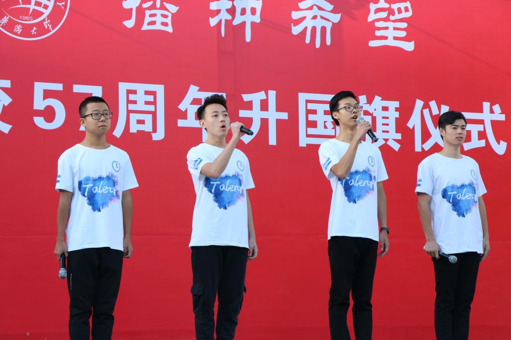华侨大学广播台的代表以华园的发展历程为线,朗诵了哲社学院王瑞晨同学创作的诗歌《不忘初心,不辱使命》。华侨大学第十八期人才学校学员们通过朗诵《少年中国说》展现华大青年精神,为母校献上祝福,现场掌声更迭。最后,全校师生齐声合唱校歌《一方沃土》,一双双年轻的眼睛投注于飘扬的国旗,传达着对母校美好祝愿与期望。